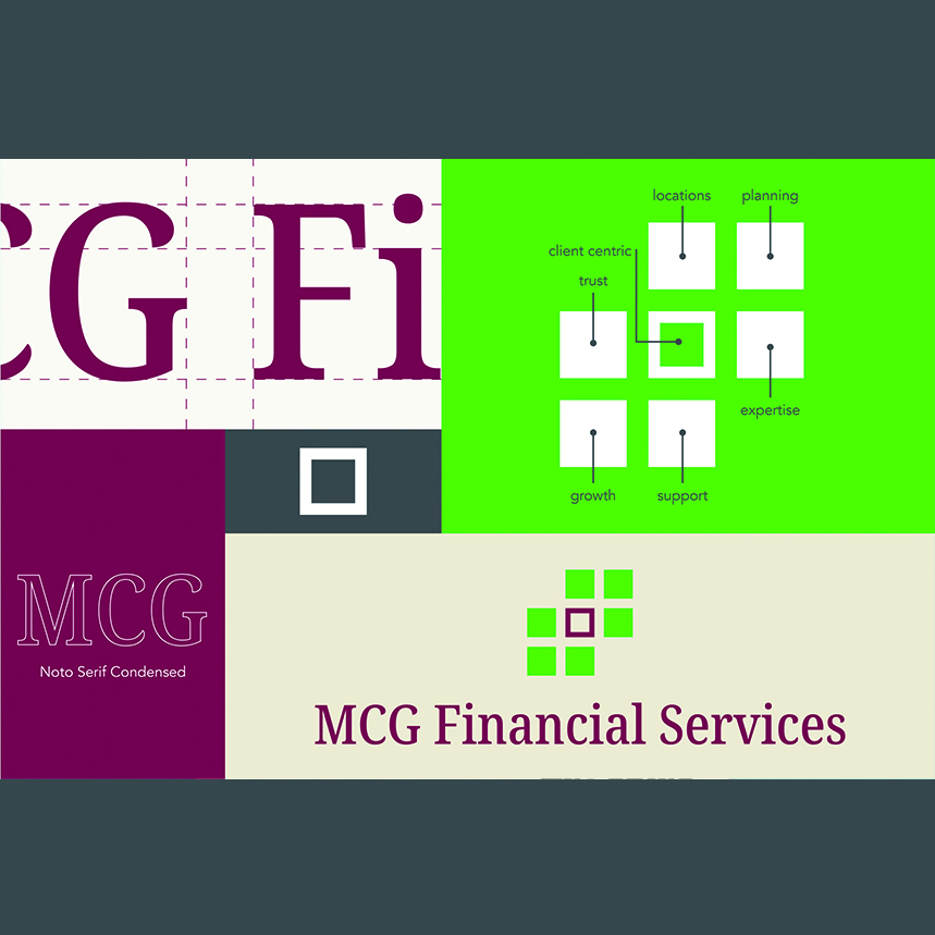 MCG Financial Services provide expert financial planning and bespoke financial solutions to their highly valued personal, business and agri clients throughout Ireland for over 40 years. This mark was inspired from the existing mark. The strong centre square represents MCG Financial Services and its client centric approach. The position of the six supporting squares suggests trust, planning, expertise, growth, support and locations. The shape represents structure and balance and symbolises relationships. A contemporary and engaging serif font has been carefully chosen to support the symbol. The mark is corporate, professional and contemporary.